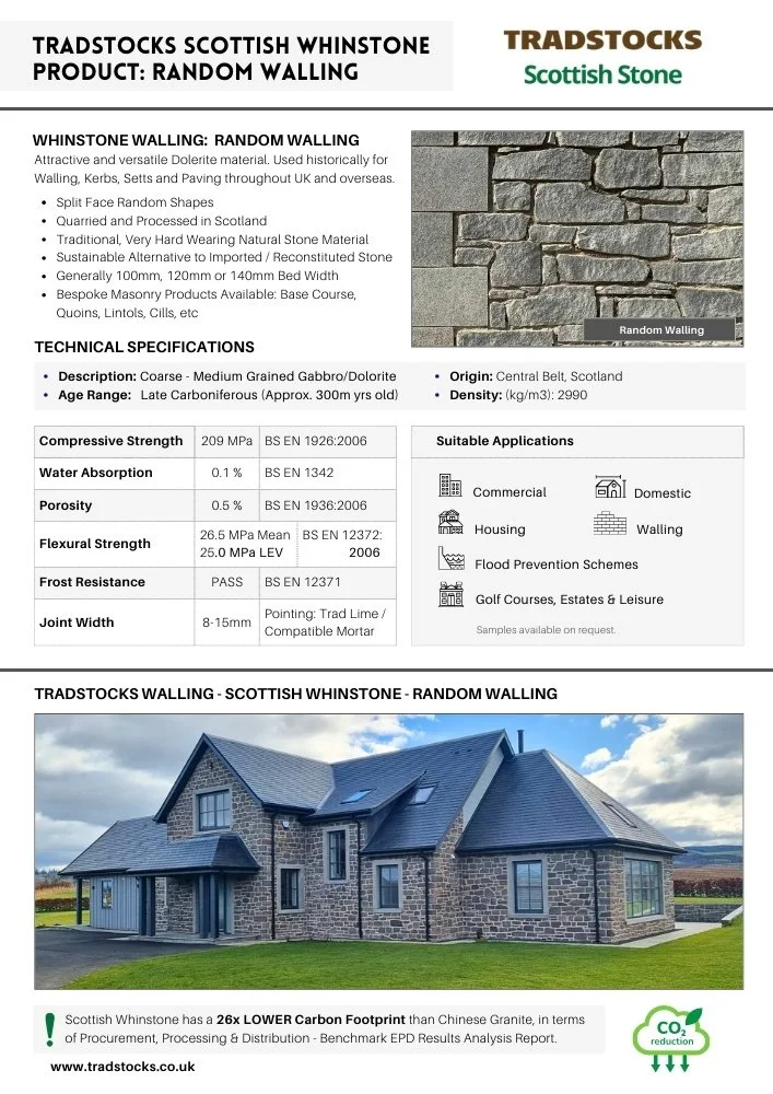 Due to the fact the natural stone is quarried and processed locally by Tradstocks, our Walling Stone provide a low carbon option compared to imported stone. Environmental Product Declarations are available for all our Scottish Whinstone products.